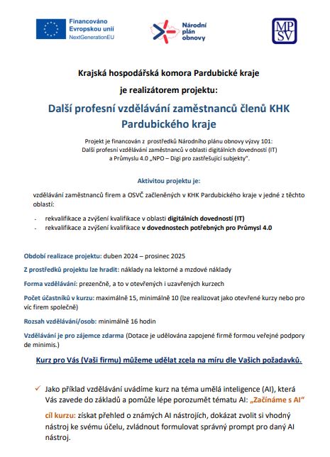 Dovolujeme si Vás informovat, že námi realizovaný projekt pro členské firmy: „Další profesní vzdělávání zaměstnanců členů KHK Pardubického kraje“ byl prodloužen do 31. 12. 2025!