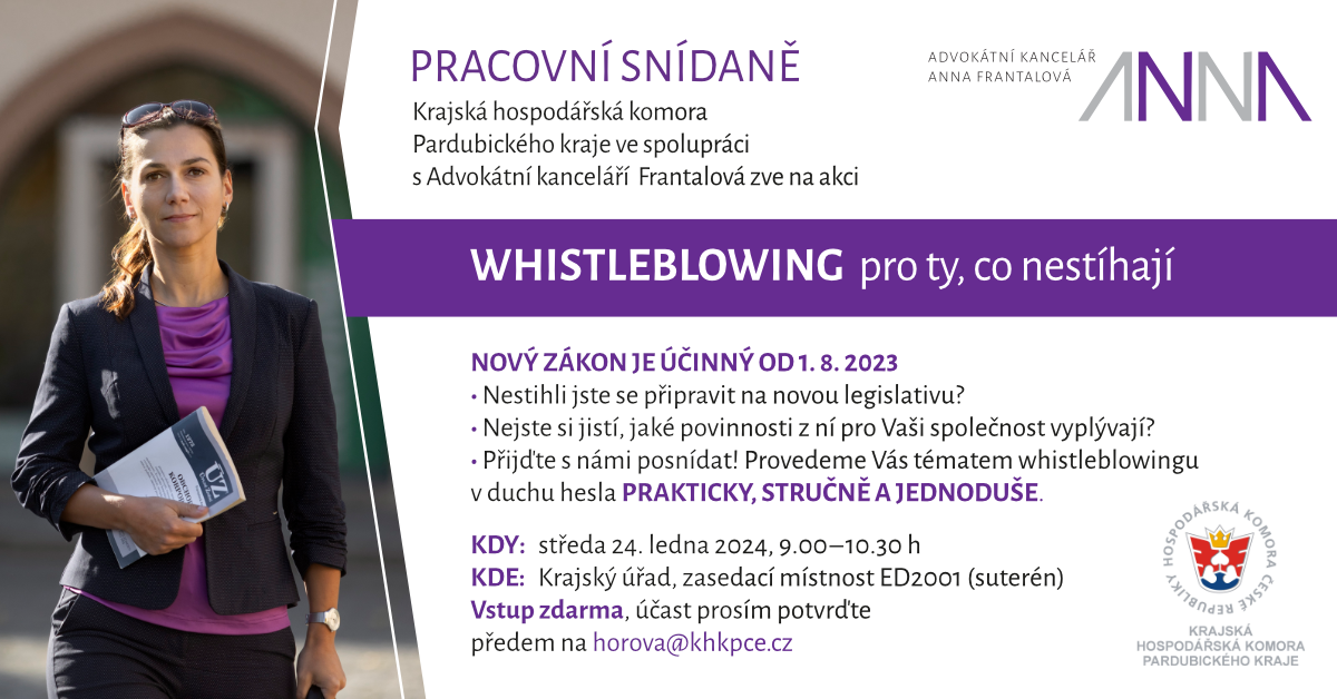 Pozvánka na pracovní snídani - WHISTLEBLOWING pro ty, co nestíhají - 24. 1. 2024, Pardubice - již proběhlo