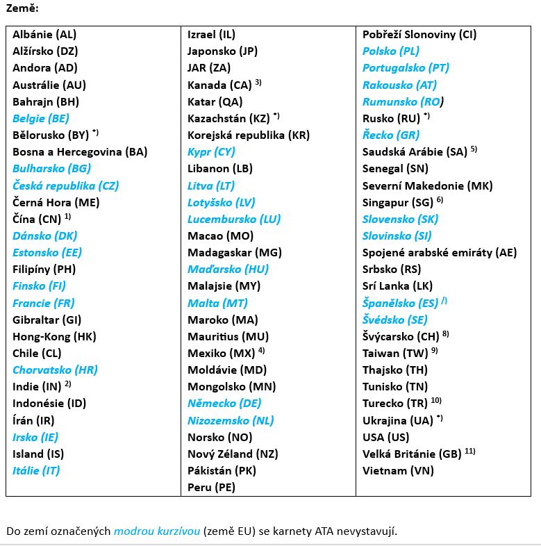 *) Vystavuje pouze HK ČR v Praze – vystavování karnetů ATA o Běloruska, Kazachstánu, Ruska a na Ukrajinu je z důvodu válečného konfliktu a uvalených sankcí pozastaveno.
